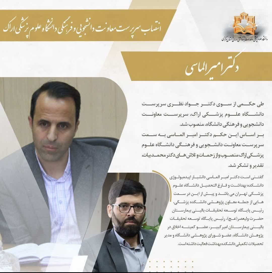 بر اساس این حکم دکتر امیر الماسی به سمت سرپرست معاونت دانشجویی و فرهنگی دانشگاه علوم پزشکی اراک منصوب و از زحمات و تلاش های دکتر محمد بیات، تقدیر و تشکر شد.