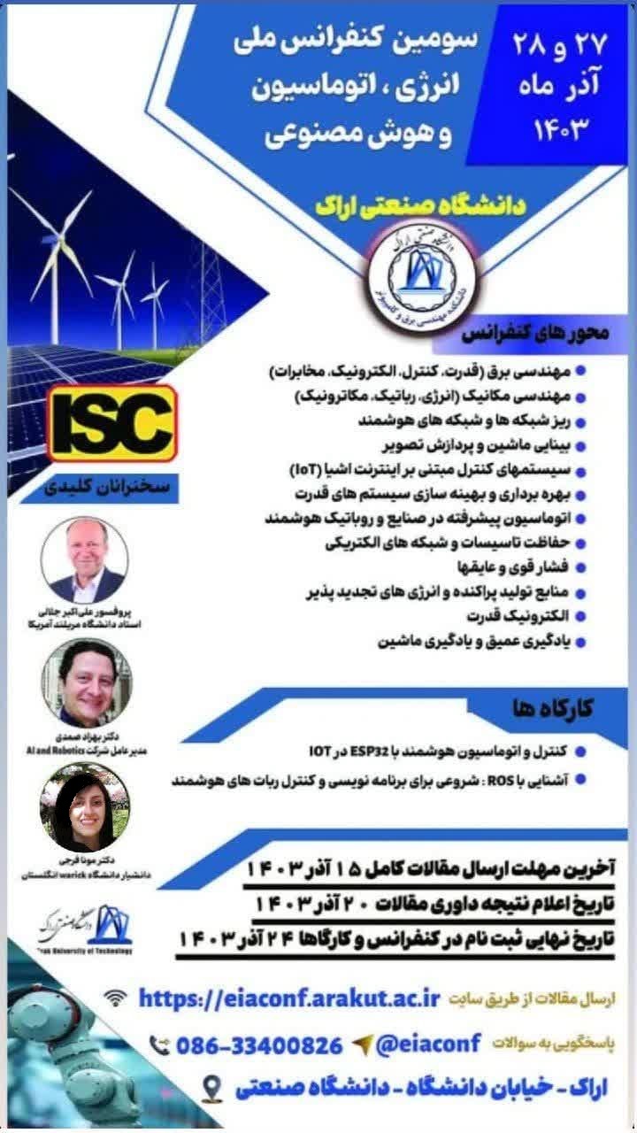 همایش ملی انرژی، اتوماسیون صنعتی وهوش مصنوعی در تاریخ۲۷ و۲۸آذر ماه۱۴۰۳در دانشـگاه صنعتی اراک برگزار می شود .