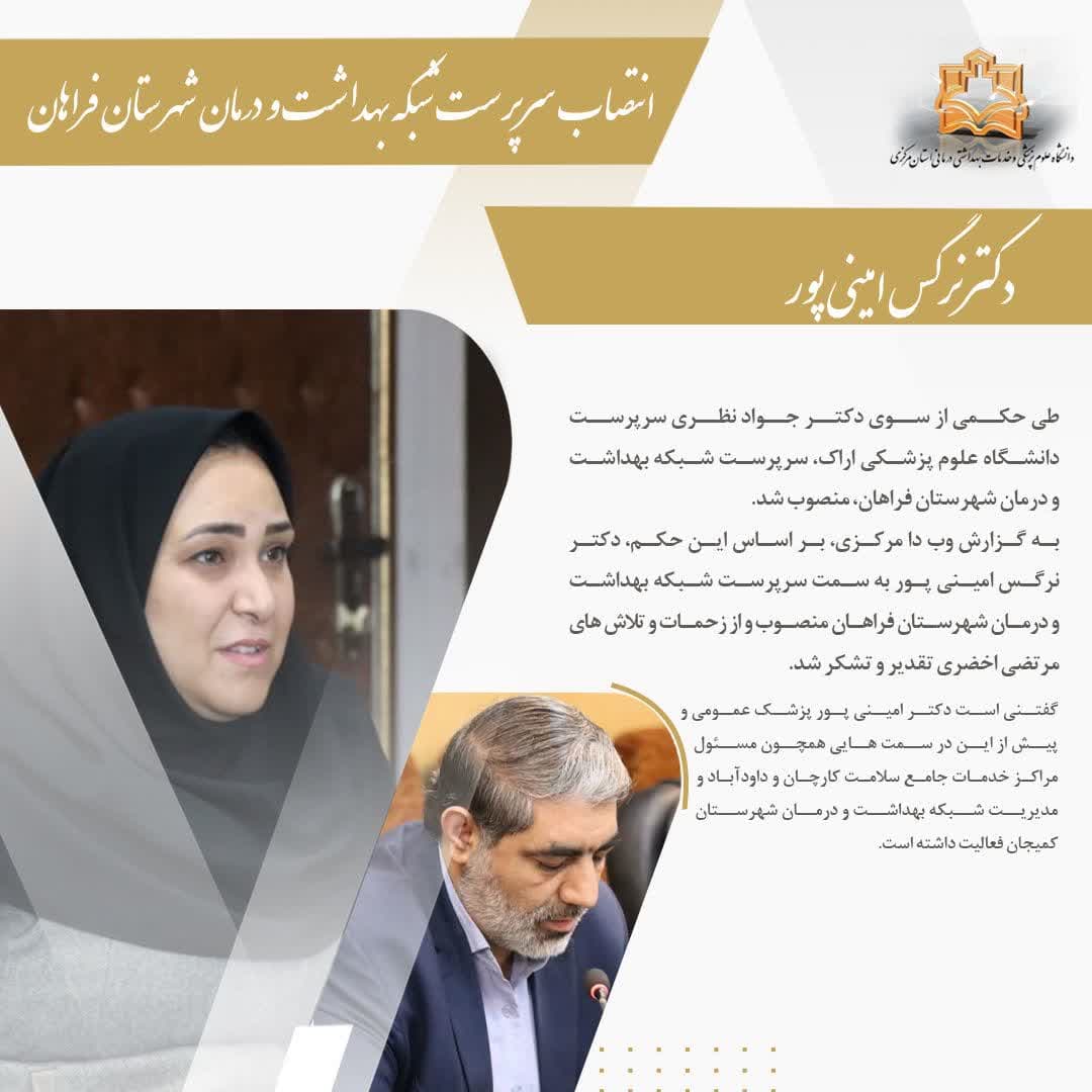 طی حکمی از سوی دکتر جواد نظری سرپرست دانشگاه علوم پزشکی اراک، سرپرست شبکه بهداشت و درمان شهرستان فراهان، منصوب شد.