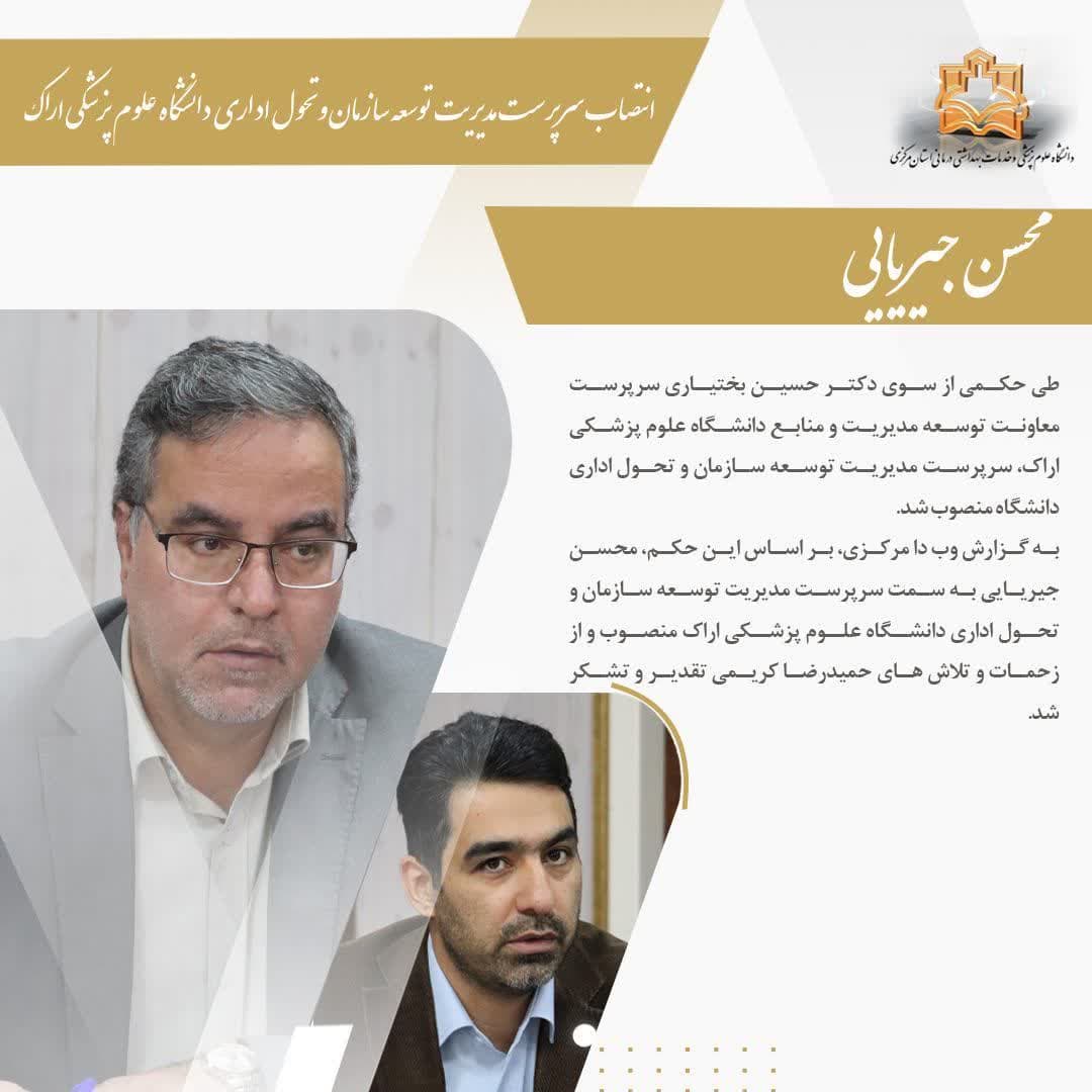 همچنین طی حکمی از سوی دکتر حسین بختیاری سرپرست معاونت توسعه مدیریت و منابع دانشگاه علوم پزشکی اراک، سرپرست مدیریت توسعه سازمان و تحول اداری دانشگاه منصوب شد.