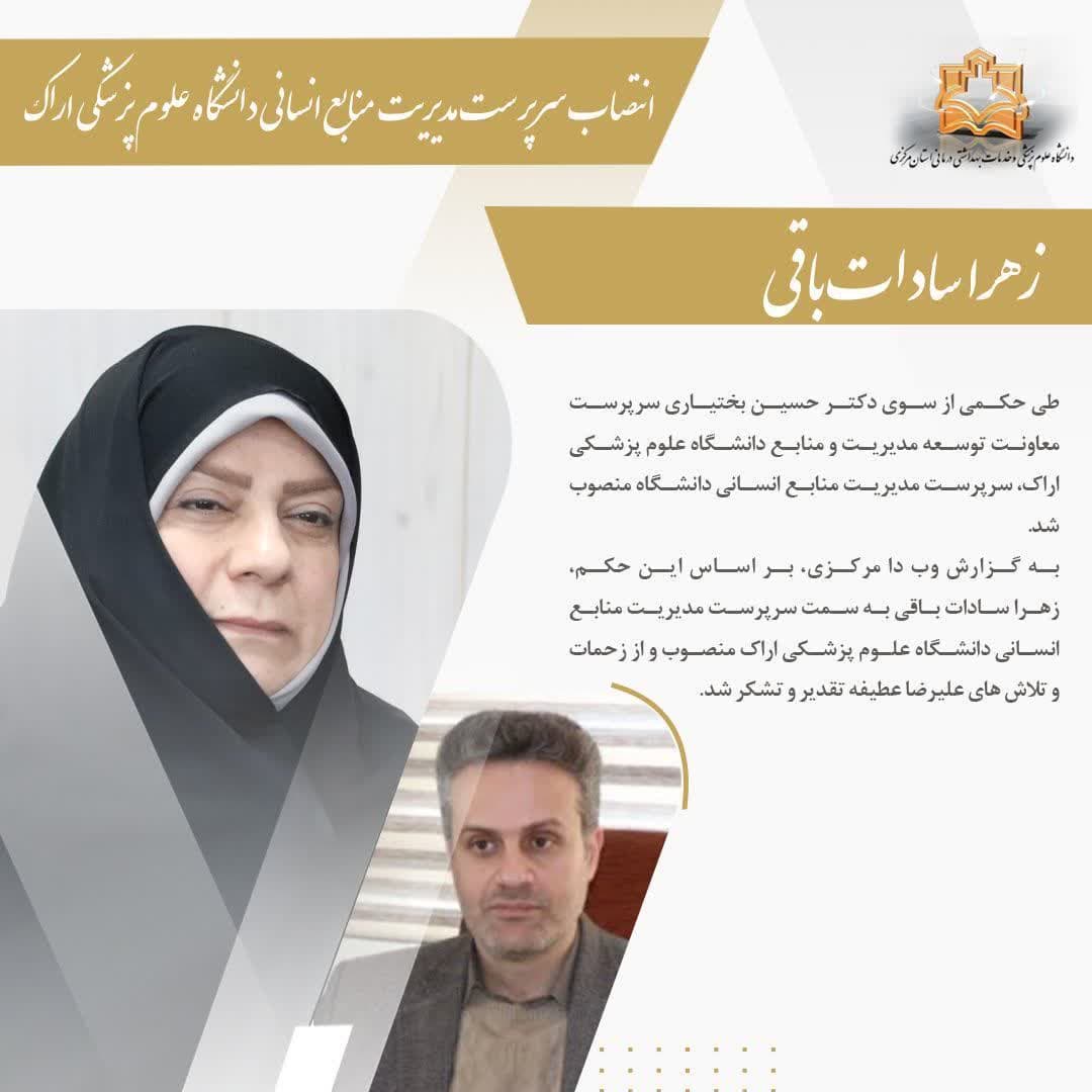 در ادامه طی حکمی از سوی دکتر حسین بختیاری سرپرست معاونت توسعه مدیریت و منابع دانشگاه علوم پزشکی اراک، سرپرست مدیریت منابع انسانی دانشگاه منصوب شد.