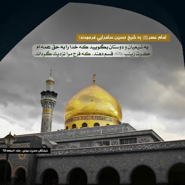 امام عصر(عجل الله تعالی فرجه الشریف) به شیخ حسین سامرایی فرمودند: به شیعیان و دوستان بگویید که خدا را به حق عمه ام حضرت زینب (سلام الله علیها) قسم دهند که فرج مرا نزدیک گرداند.