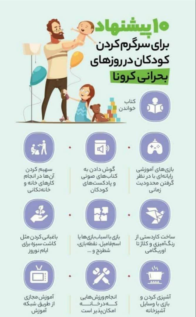 در این روزهای بحرانی تا میتوانید پای صحبتهای بچه ها بنشینید، به آنها توجه کرده و برایشان وقت بگذارید و با فراهم کردن فرصت بازی با آنها آرامش را به وجودشان بازگردانید و اطمینان دهید که همه چیز به زودی مرتب خواهد شد.