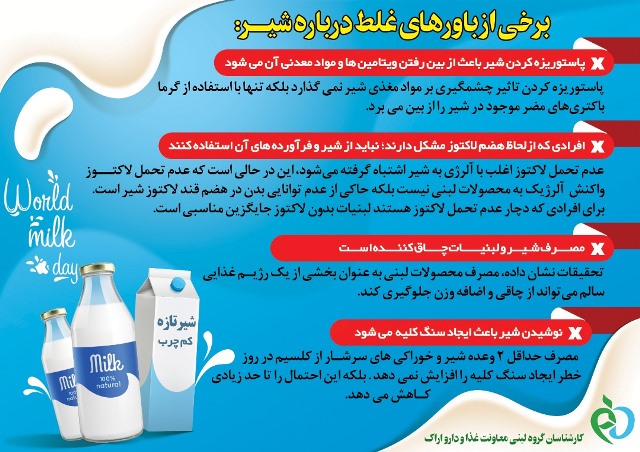 به نقل از روابط عمومی معاونت غذا و دارو اراک، مهندس محدثه آصفری کارشناس اداره نظارت بر مواد غذایی معاونت غذا و دارو در پیامی به مناسبت روز جهانی شیر گفت: در جامعه امروز یکی از مهمترین شاخصهای توسعه فرهنگی، سرانه مصرف شیر و فرآورده های آن است. در هرم مواد غذایی، لبنیات جایگاه ویژه ای دارند و تاکید می شود هر فرد با توجه به سن و جنس خود، روزانه بین 2 تا 4 واحد شیر یا سایر لبنیات مصرف کند. از طرفی پژوهشهای اخیر نقش مهم و موثر محصولات لبنی را در کاهش فشار و چربی خون، جلوگیری از ابتلا به انواع سرطانها، سکته مغزی، بیماریهای قلبی عروقی، عفونت ادراری، سندروم پیش از قاعدگی و پیشگیری از پوکی استخوان، پوسیدگی دندان و چاقی گزارش کرده اند.