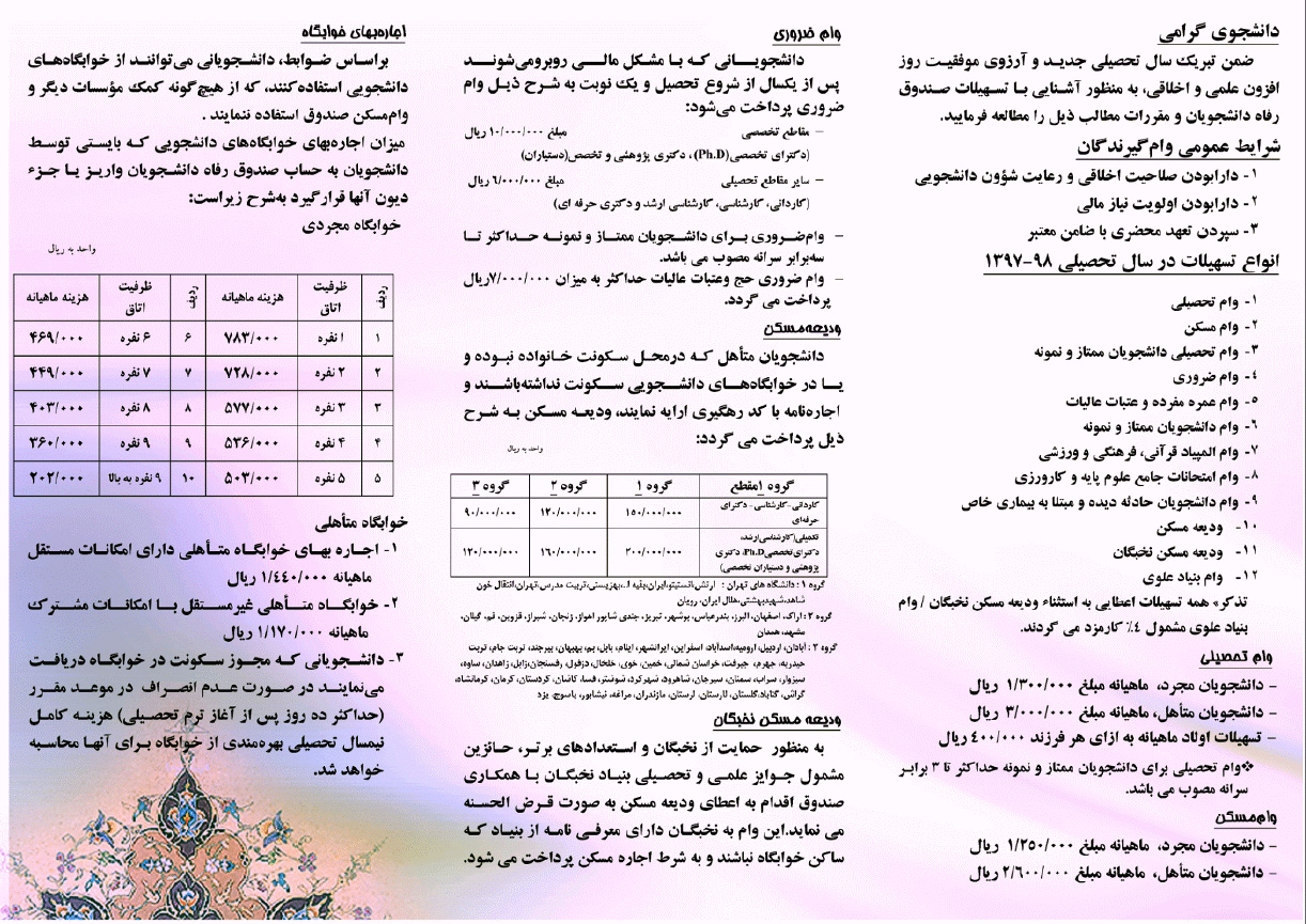 به دانشجویانی که عازم سفر عتبات عالیات می باشند،پس از سفر و با ارائه گذرنامه دارای مهر ورود و خروج به عراق یک نوبت وام ضروری به میزان 30.000.000ریال برای همه مقاطع تحصیلی پرداخت می گردد.