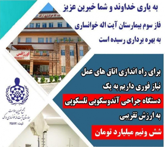به یاری خداوند و شما خیّرین عزیز همانطور که مستحضرید فاز سوم بیمارستان آیت اله خوانساری به بهره برداری رسیده است؛ برای راه اندازی اتاق های عمل نیاز مبرم به یک دستگاهِ جراحی آندوسکوپیِ تلسکوپی به ارزش تقریبی شش و نیم میلیارد تومان می باشد؛ لذا خواهشمندیم همچون گذشته با کمکهای خود ما را یاری فرمایید، تا هرچه سریع تر اتاق های جراحی تجهیز و آماده خدمت رسانی به بیماران گردد.